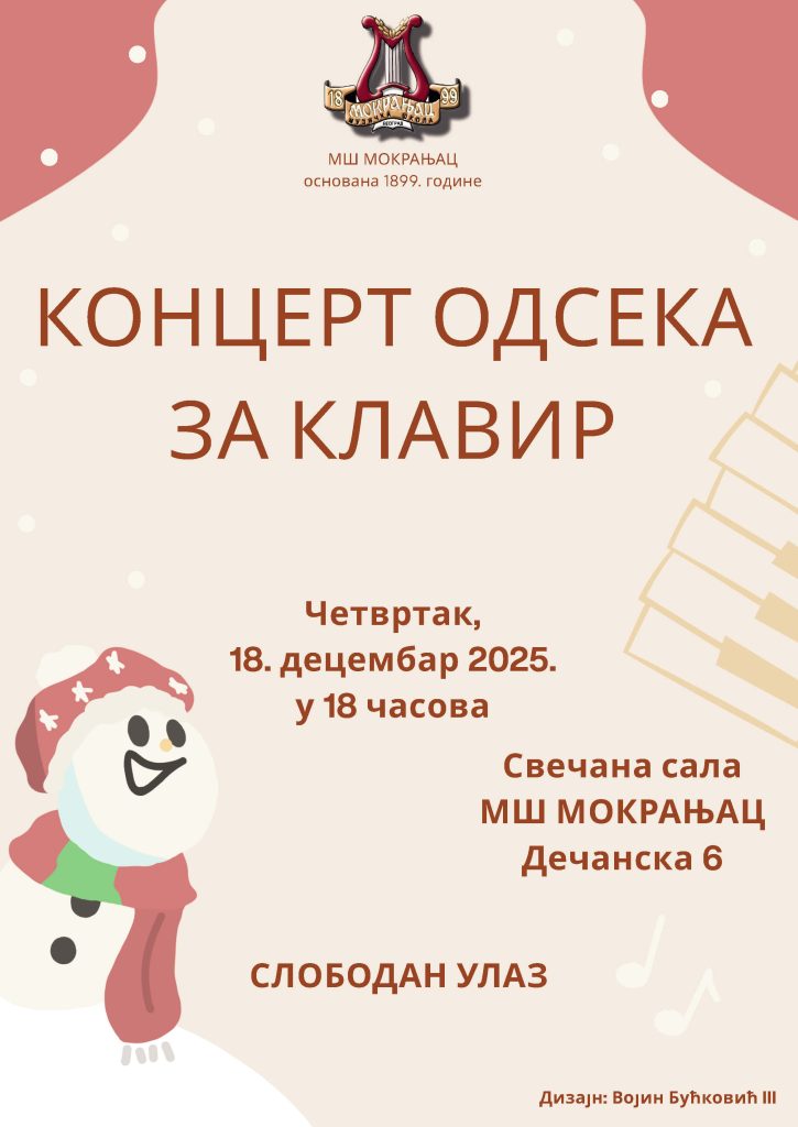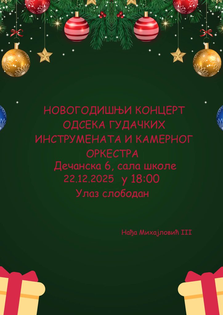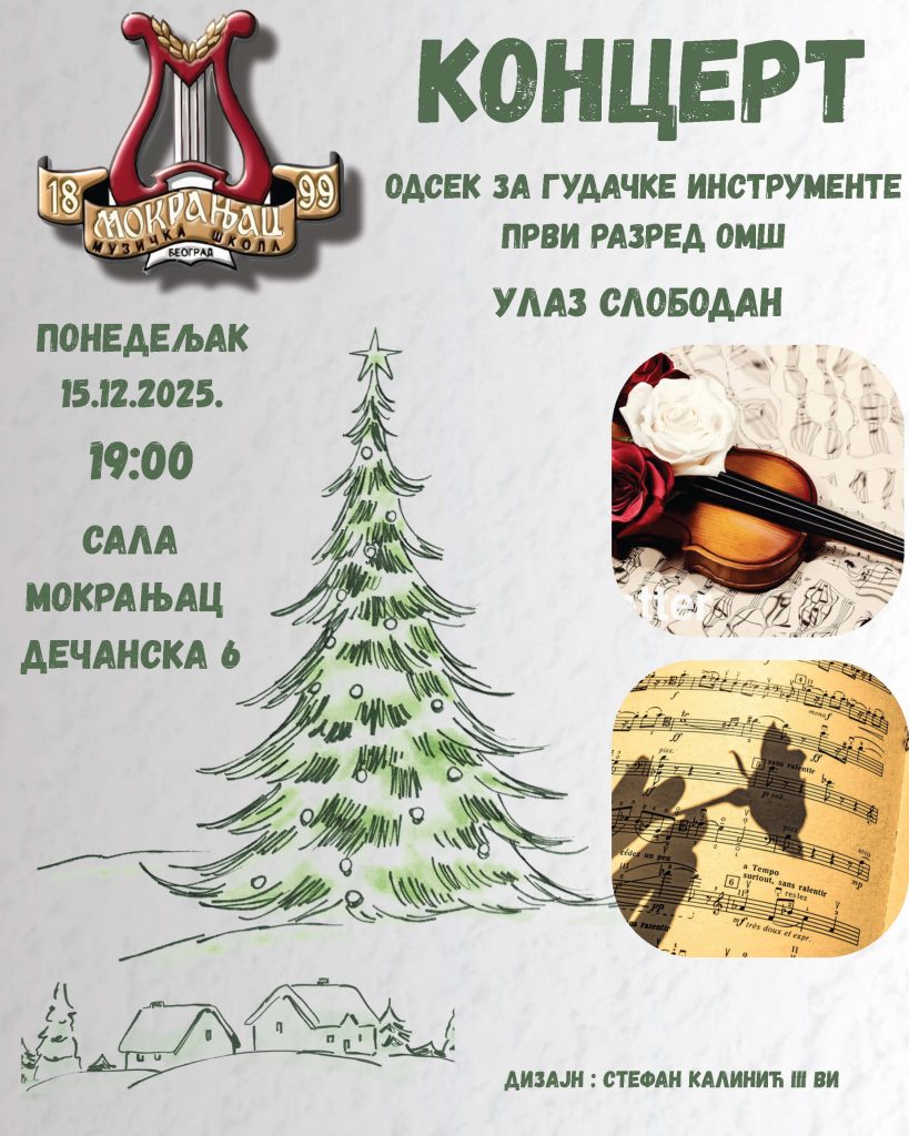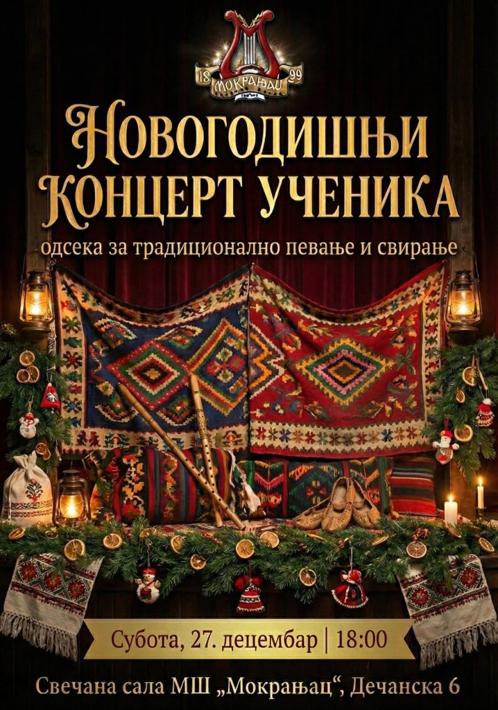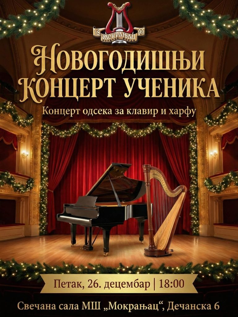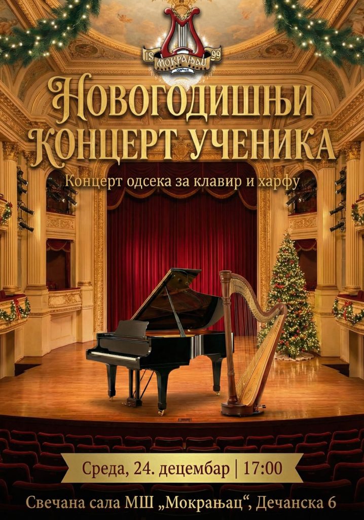 Позивамо вас на Новогодишње концерте музичке школе „Мокрањац“, од 14. до 29. децембра. Добро нам дошли!